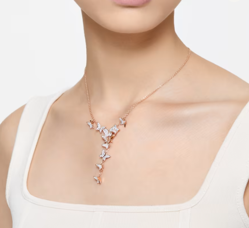 Aggiungi un tocco di fascino tutto femminile al look quotidiano, con questa collana. Ideata con una classica placcatura color oro rosa, presenta delicati motivi a farfalla, decorati con un brillante pavé. Indossala sia con una semplice t-shirt bianca che su un abito da sera elegante: l’effetto sarà sempre spettacolare.